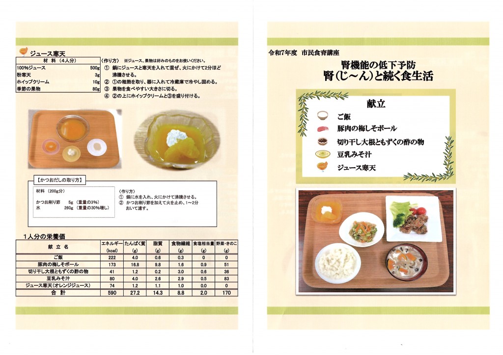 令和7年9月17日(水)潮見公民館にて、松山市の委託事業として「腎機能の低下予防」のテーマで管理栄養士の講話と調理実習を行いました。